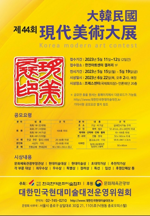 매년 공모전과 전시회 그리고 시상을 통해 참신한 작가들을 배출하고 있는 ‘대한민국 현대미술대전’은 올해로 44주년을 맞이하면서 지난 5월 11일 부터 접수를 시작하여 5월 19일 까지 심사, 전시기간을 거쳐 오는 6월 26일 시상식을 가질 예정이다.